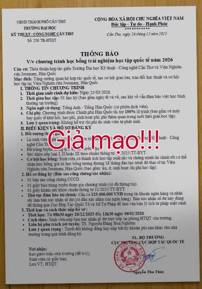 Hiện nay xuất hiện một số đối tượng đưa thông tin sai sự thật, giả mạo liên quan đến các hoạt động của Trường Đại học Kỹ thuật – Công nghệ Cần Thơ, Nhà trường đề nghị Quý Thầy Cô, các em Sinh viên và cộng đồng nâng cao cảnh giác trước các thông tin sai lệch, giả mạo có thể xuất hiện liên quan đến các hoạt động của Trường, đặc biệt trong lĩnh vực hợp tác quốc tế và đào tạo sau đại học.