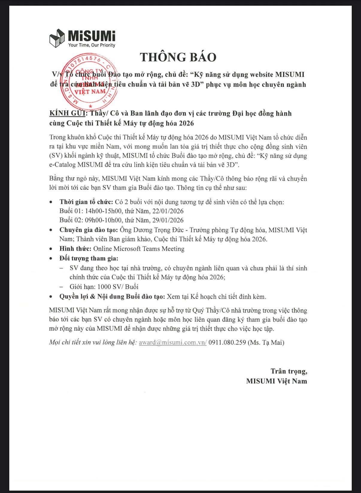 Liên hệ: award@misumi.com.vn | 0911.080.259 (Ms. Tạ Mai)