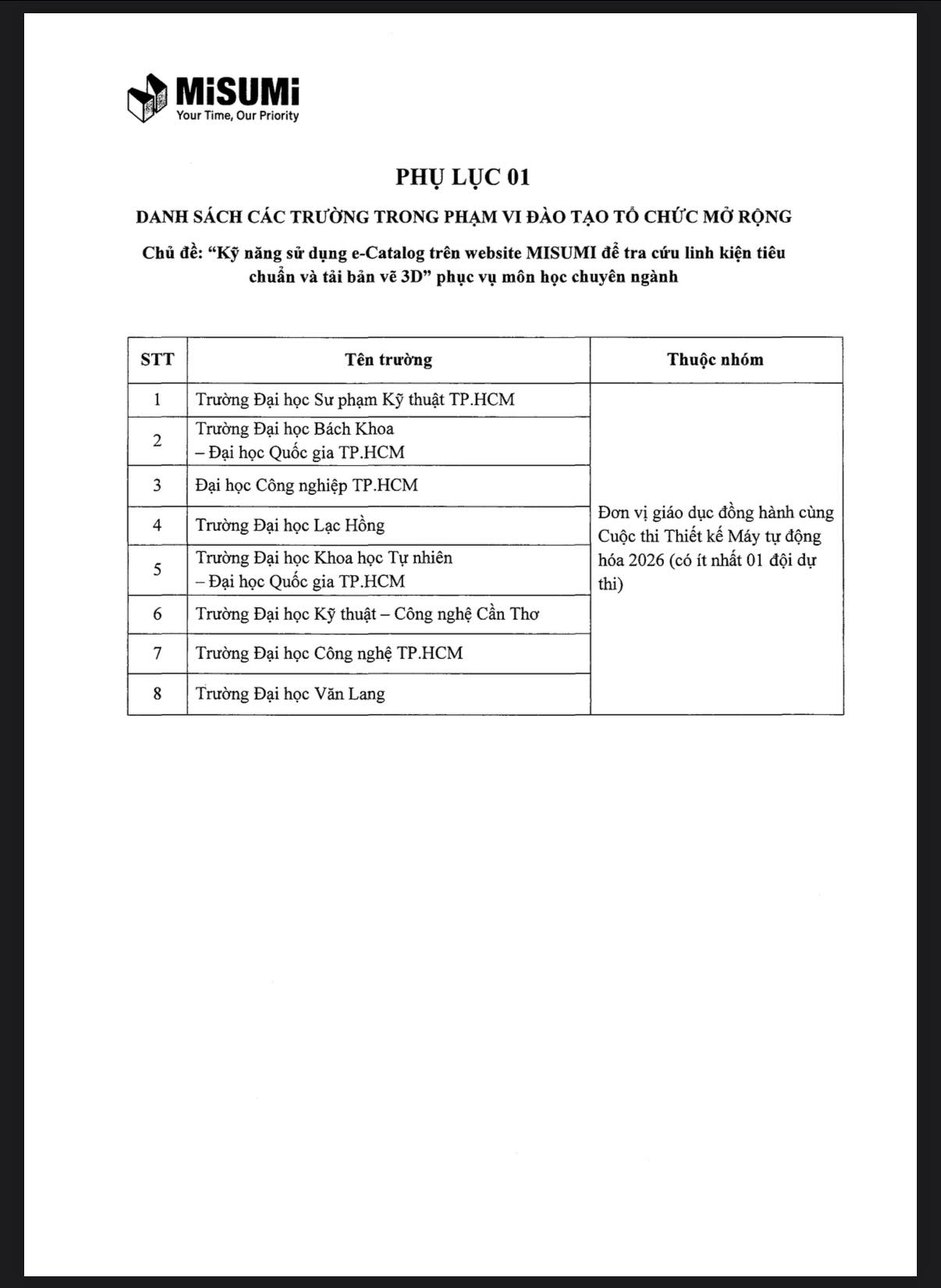 Nhằm mang đến giá trị thực tiễn cho sinh viên ngành kỹ thuật, đặc biệt là các bạn chưa có cơ hội tham gia Cuộc thi Thiết kế Máy Tự động hóa 2026, MISUMI Việt Nam tổ chức Buổi đào tạo mở rộng với chủ đề: