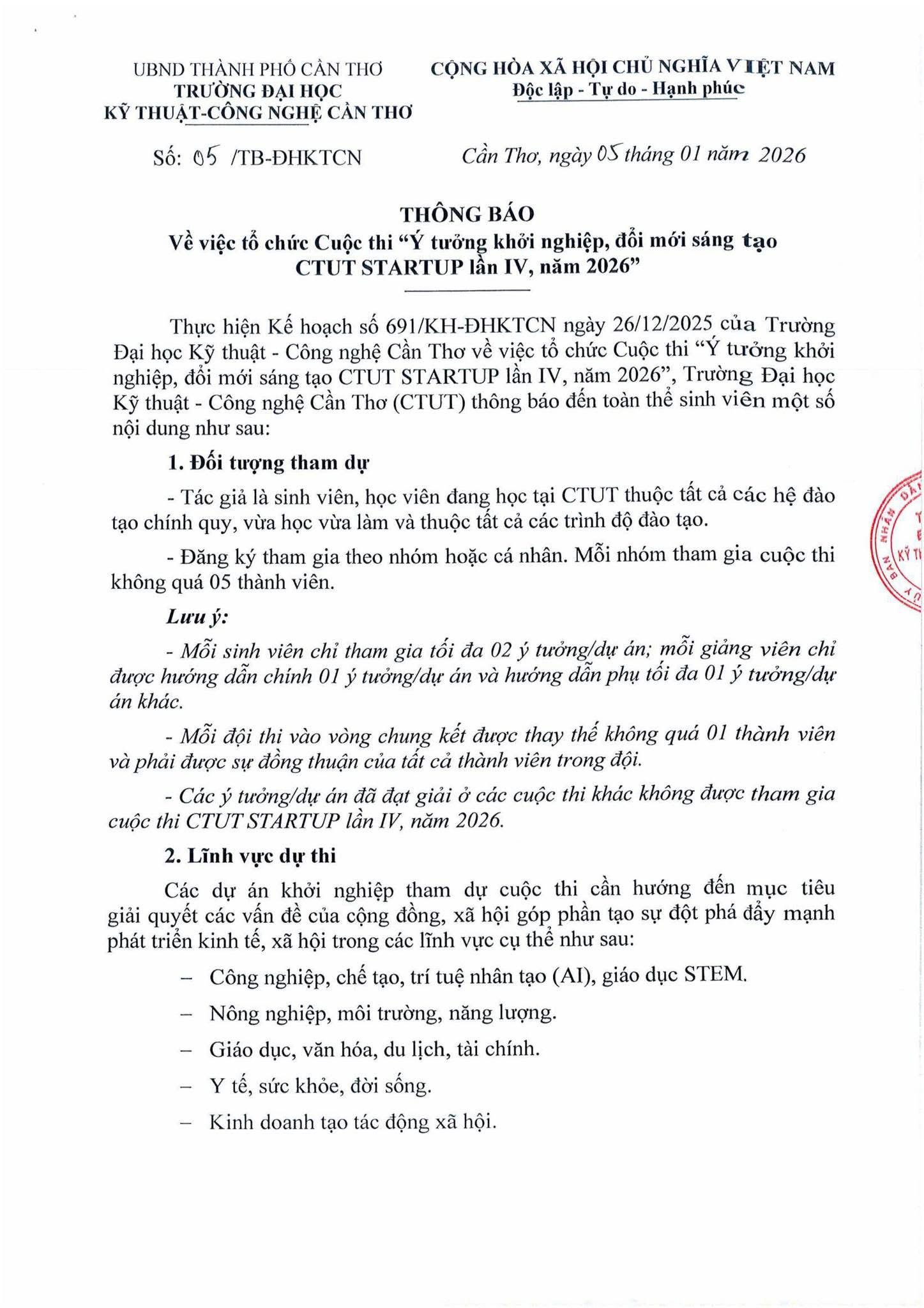 Trường Đại học Kỹ thuật – Công nghệ Cần Thơ thông báo tổ chức cuộc thi “Ý tưởng khởi nghiệp, đổi mới sáng tạo CTUT STARTUP lần IV, năm 2026” dành cho sinh viên.