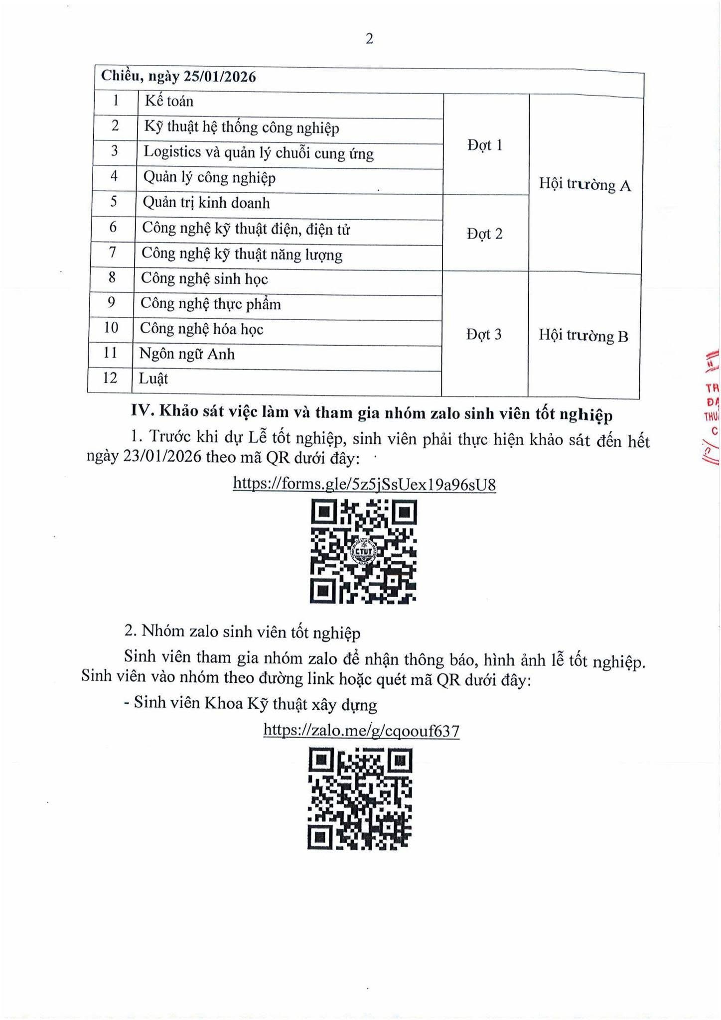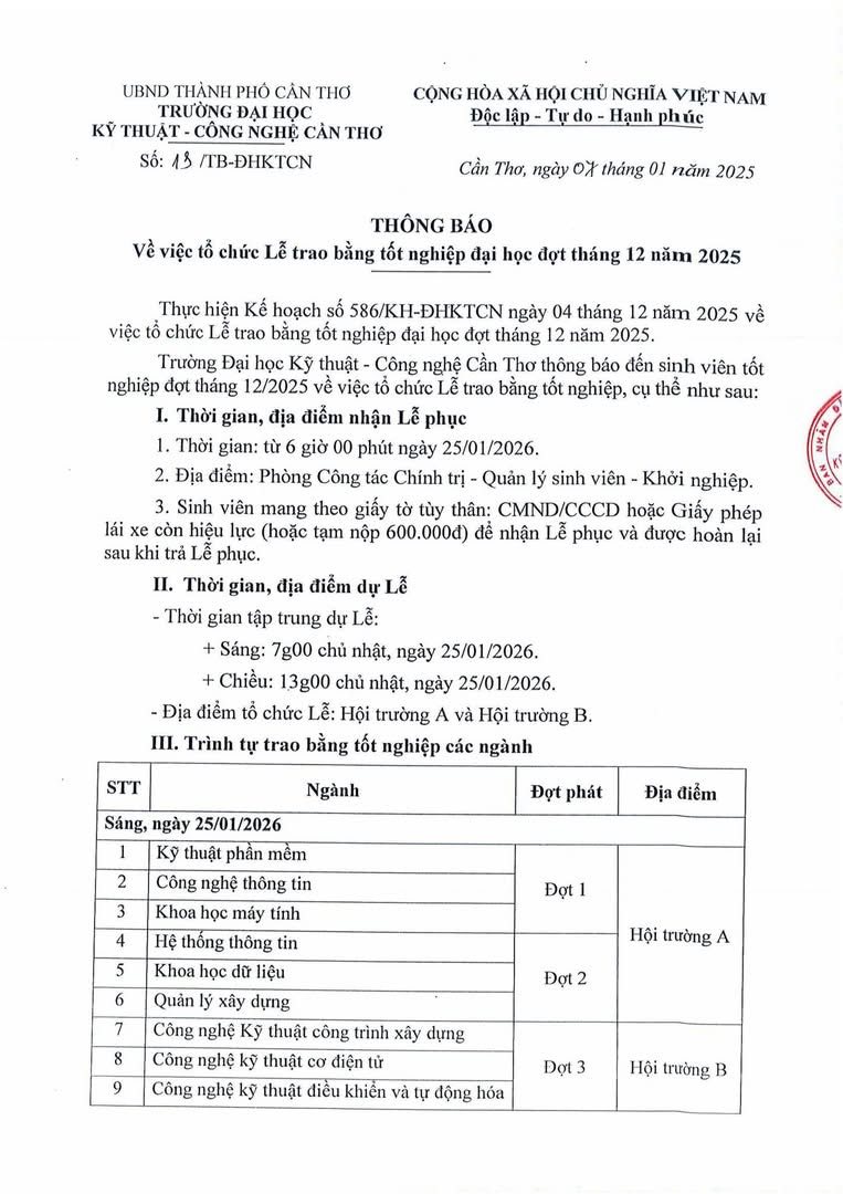 THÔNG BÁO TỔ CHỨC LỄ TRAO BẰNG TỐT NGHIỆP ĐẠI HỌC ĐỢT THÁNG 12 NĂM 2025 Tin tức sự kiện 09/01/202612/01/2026 FME_CTUET20Leave a Comment on THÔNG BÁO TỔ CHỨC LỄ TRAO BẰNG TỐT NGHIỆP ĐẠI HỌC ĐỢT THÁNG 12 NĂM 2025 THÔNG BÁO TỔ CHỨC LỄ TRAO BẰNG TỐT NGHIỆP ĐẠI HỌC ĐỢT THÁNG 12 NĂM 2025 Trân trọng./.