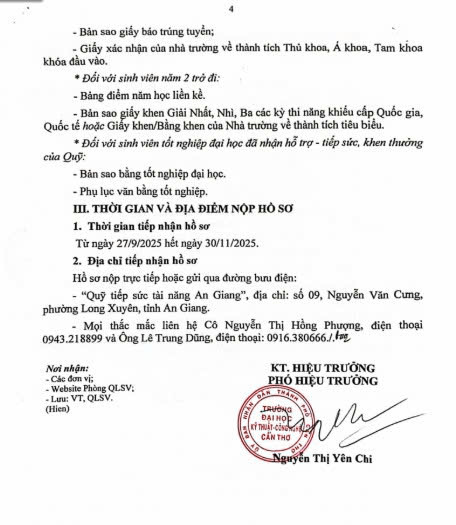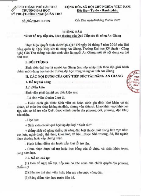 Thông báo về xét hỗ trợ, tiếp sức, khen thưởng của Quỹ Tiếp sức tài năng An Giang Thông tin học bổng Tin tức sự kiện 01/10/202510/10/2025 FME_CTUET0Leave a Comment on Thông báo về xét hỗ trợ, tiếp sức, khen thưởng của Quỹ Tiếp sức tài năng An Giang Trân trọng ./.